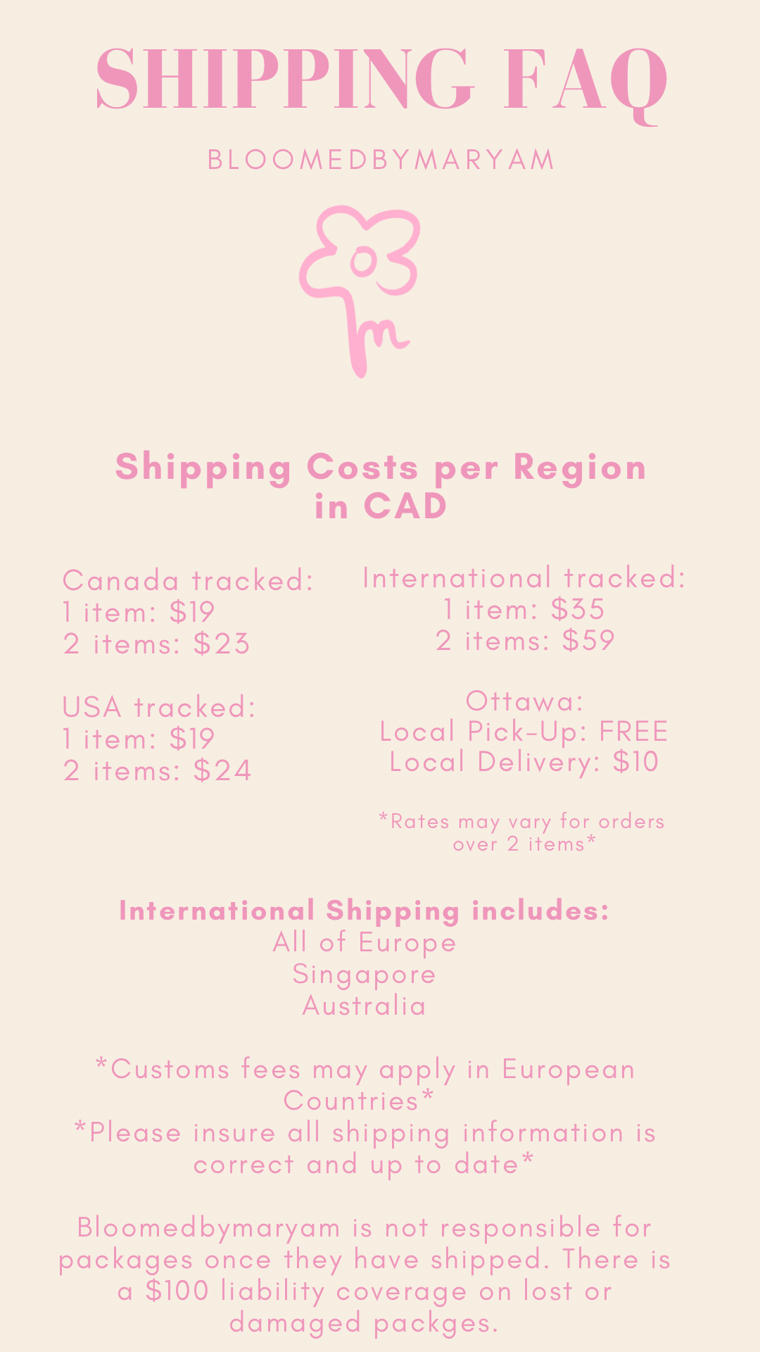 Shipping is done through Canada Post tracked shipping. You will receive your tracking number through email once your order is shipped. Please find all shipping rate below and don't hesitate to contact us in the case of any questions.